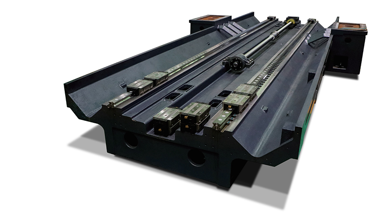 La table du centre d'usinage à portique est de forme essentiellement rectangulaire. Les pièces moulées, volumineuses et lourdes, telles que la table, le bâti, la colonne, la poutre et le coulisseau, sont en fonte ou soudées. La structure interne de ces pièces, de type nid d'abeille composite, bénéficie d'une conception avancée. L'ensemble a subi un traitement de vieillissement et de revenu secondaire afin d'éliminer les contraintes internes résiduelles et de stabiliser le matériau, garantissant ainsi la précision d'usinage et la durée de vie de la machine-outil.