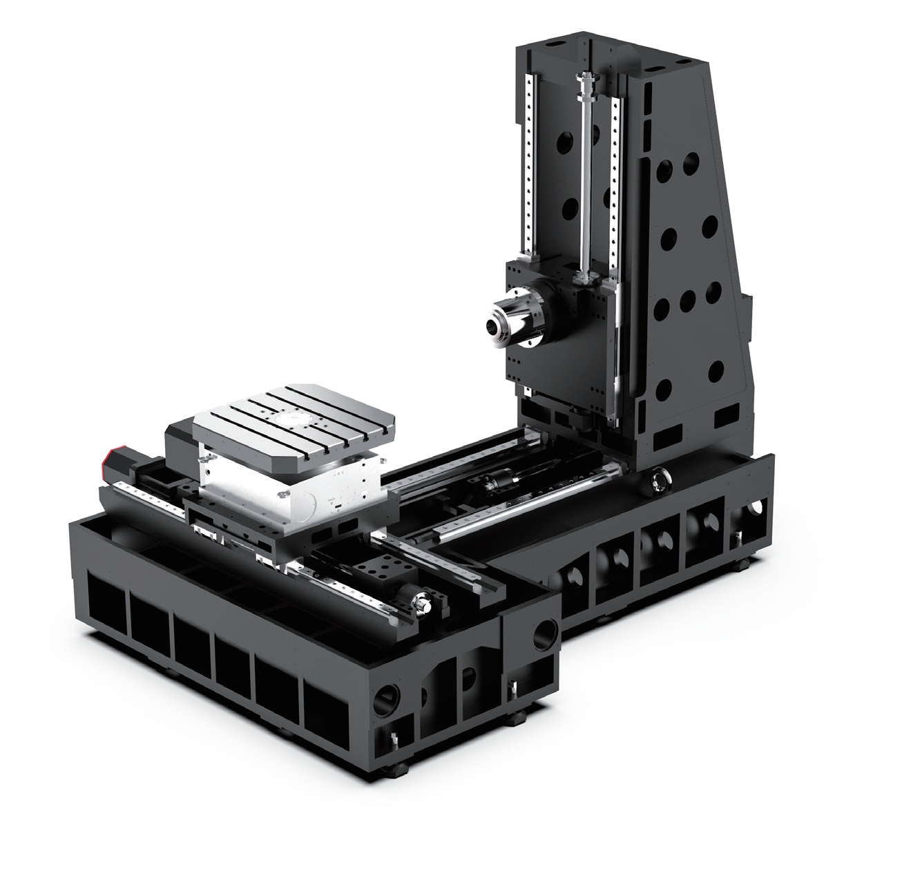Le bâti est en forme de T ; la table de travail se déplace selon l’axe X sur le bâti avant, tandis que la colonne se déplace selon l’axe Z sur le bâti arrière. Le bâti de broche peut être fixé de deux manières : par suspension directe ou latérale sur la colonne, et se déplace selon l’axe Y. Cette machine est adaptée à l’usinage multi-opérations, comme le perçage et le fraisage de pièces de moyenne et grande taille, notamment de grande longueur.